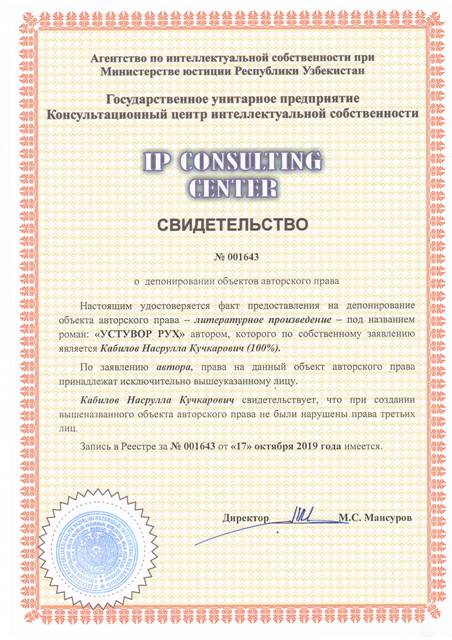 | 8545 | №001643 | Литературное произведение - роман: "УСТУВОР РУҲ" | Кабилов Насрулла Кучкарович (100%) | Кабилов Насрулла Кучкарович | 10/17/2019 | ![]() |