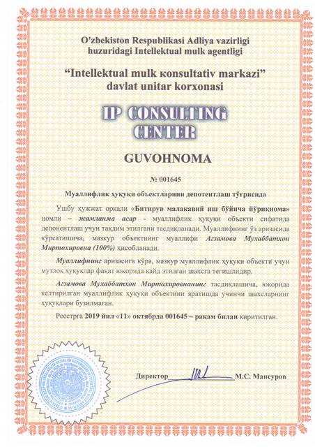 | 8541 | №001647 | Жамланма асар - "Жиноят – ижроия қонунчилигини такомиллаштириш масалалари (илмий-амалий семинар материаллари тўплами)" | Адилов Бахрамбек Кахраманович (50%), Сайдалиев Ахмадхон Махмудович (50%) | Адилов Бахрамбек Кахраманович, Сайдалиев Ахмадхон Махмудович | 10/17/2019 | ![]() |