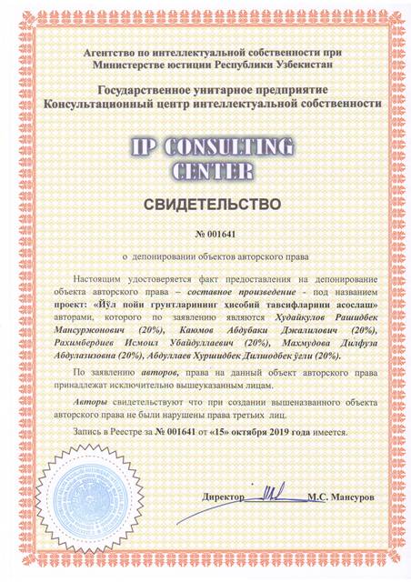 | 8547 | №001641 | Составное произведение - проект: "Йўл пойи грунтларининг ҳисобий тавсифларини асослаш" | Худайкулов Рашидбек Мансуржонович (20%), Каюмов Абдубаки Джалилович (20%), Рахимбердиев Исмоил Убайдуллаевич (20%), Махмудова Дилфуза Абдулазизовна (20%), Абдуллаев Хуршидбек Дилшодбек ўғли (20%) | Худайкулов Рашидбек Мансуржонович, Каюмов Абдубаки Джалилович, Рахимбердиев Исмоил Убайдуллаевич, Махмудова Дилфуза Абдулазизовна, Абдуллаев Хуршидбек Дилшодбек ўғли | 10/15/2019 | ![]() |
