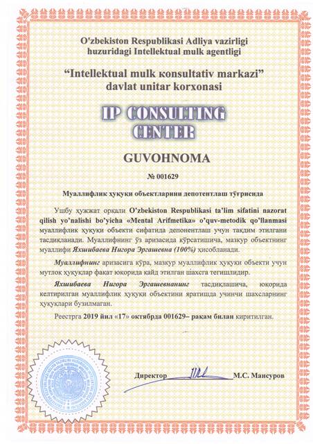 | 8559 | №001629 | O’zbekiston Respublikasi ta’lim sifatini nazorat qilish yo’nalishi bo’yicha "Mental Arifmetika" o’quv-metodik qo’llanmasi | Яхшибаева Нигора Эргашевна (100%) | Яхшибаева Нигора Эргашевна | 10/17/2019 | ![]() |