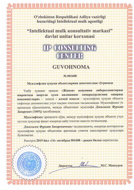 | 8580 | №001608 | Илмий мақола - "Жиноят қонунини либераллаштириш шароитида шартли ҳукм қилишнинг самарадорлигини ошириш имкониятлари" | Джалилов Фуркат Закирович (100%) | Джалилов Фуркат Закирович | 10/14/2019 | ![]() |