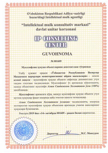| 8579 | №001609 | Илмий мақола - "Ўзбекистон Республикаси Вазирлар Маҳкамаси қарорлари мониторингининг айрим масалалари" | Алиев Саидазизхон Холматжон ўғли (100%) | Алиев Саидазизхон Холматжон ўғли | 10/14/2019 | ![]() |