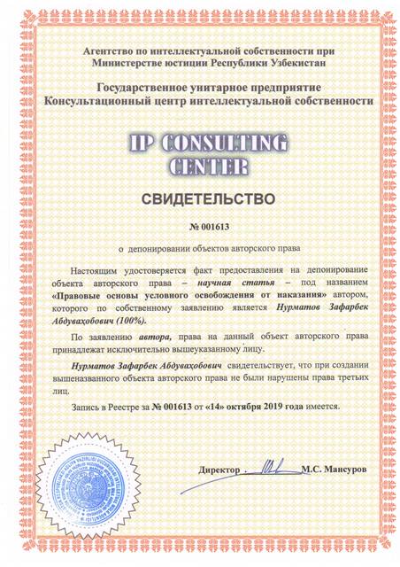 | 8575 | №001613 | Научная статья - "Правовые основы условного освобождения от наказания" | Нурматов Зафарбек Абдуваҳобович (100%) | Нурматов Зафарбек Абдуваҳобович | 10/14/2019 | ![]() |
