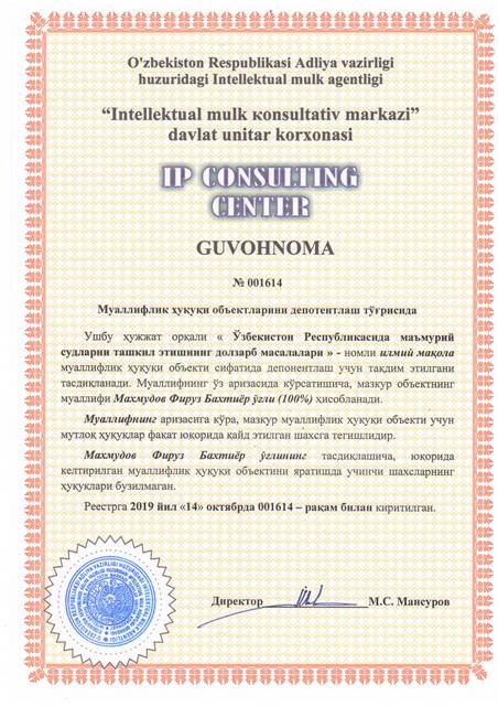 | 8574 | №001614 | Илмий мақола - "Ўзбекистон Республикасида маъмурий судларни ташкил этишнинг долзарб масалалари" | Махмудов Фируз Бахтиёр ўғли (100%) | Махмудов Фируз Бахтиёр ўғли | 10/14/2019 | ![]() |