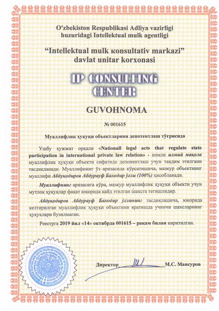 | 8573 | №001615 | Илмий мақола - "Nationall legal acts that regulate state participation in international private law relation" | Абдуқодиров Абдурауф Баходир ўғли (100%) | Абдуқодиров Абдурауф Баходир ўғли | 10/14/2019 | ![]() |