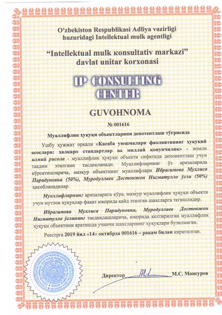 | 8572 | №001616 | Илмий рисола - "Касаба уюшмалари фаолиятининг ҳуқуқий асослари: халқаро стандартлар ва миллий қонунчиликn" | Ибрагимова Мухлиса Паридуновна (50%), Муродуллаев Достонжон Нигматулло ўғли (50%) | Ибрагимова Мухлиса Паридуновна, Муродуллаев Достонжон Нигматулло ўғли | 10/14/2019 | ![]() |