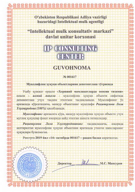 | 8571 | №001617 | Илмий мақола - "Хорижий мамлакатларда пенсия тизими" | Раҳимқулова Лола Улуғмуродова (100%) | Раҳимқулова Лола Улуғмуродова | 10/14/2019 | ![]() |