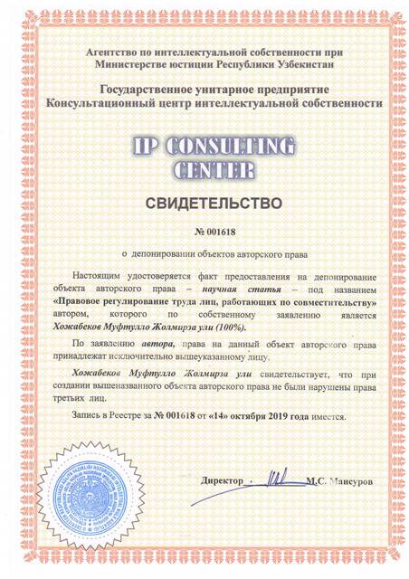 | 8570 | №001618 | Научная статья - "Правовое регулирование труда лиц, работающих по совместительству" | Хожабеков Муфтулло Жолмирза ули (100%) | Хожабеков Муфтулло Жолмирза ули | 10/14/2019 | ![]() |