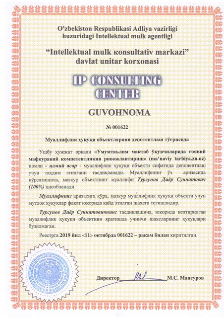 | 8566 | №001622 | Илмий асар - "Умумтаълим мактаб ўқувчиларида ғоявий мафкуравий компетентликни ривожлантириш" (ma‘naviy tarbiya.zn.uz) | Турсунов Диёр Суннатович (100%) | Турсунов Диёр Суннатович | 10/11/2019 | ![]() |