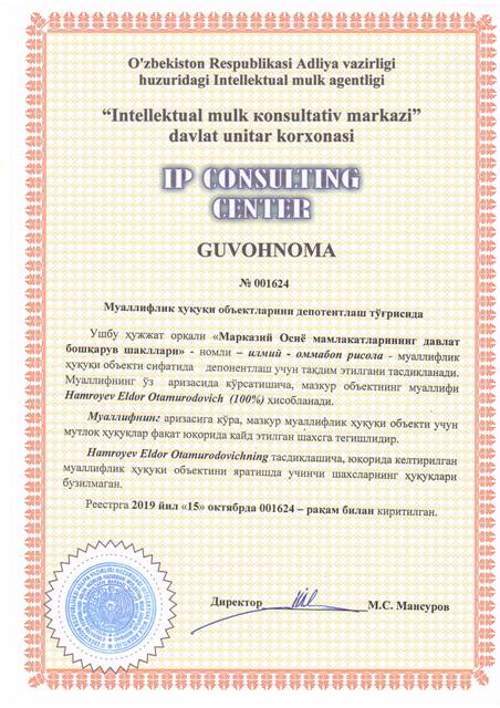 | 8564 | №001624 | Илмий - оммабоп рисола - "Марказий Осиё мамлакатларининг давлат бошқарув шакллари" | Hamroyev Eldor Otamurodovich (100%) | Hamroyev Eldor Otamurodovich | 10/15/2019 | ![]() |