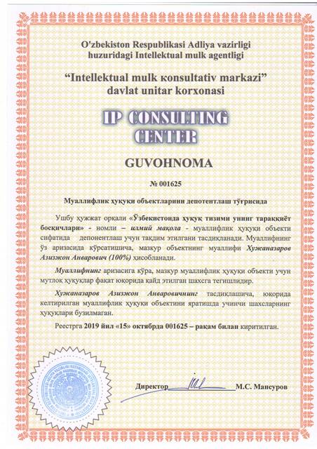 | 8563 | №001625 | Илмий мақола - "Ўзбекистонда ҳуқуқ тизими унинг тараққиёт босқичлари" | Хужаназаров Азизжон Анварович (100%) | Хужаназаров Азизжон Анварович | 10/15/2019 | ![]() |