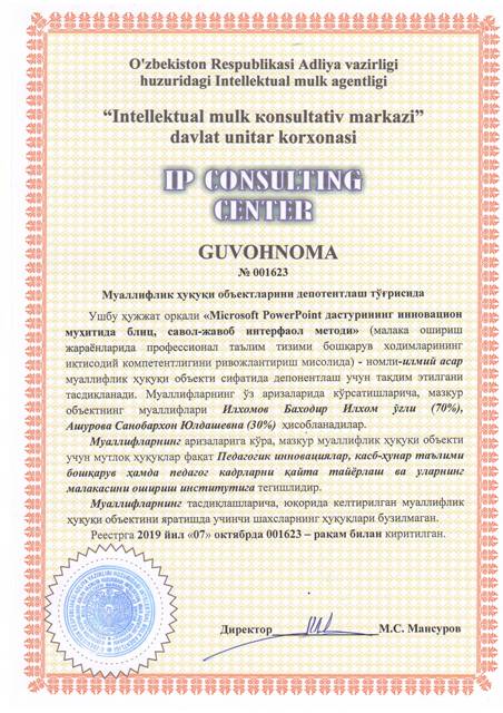 | 8565 | №001623 | Илмий асар - "Microsoft PowerPoint дастурининг инновацион муҳитида блиц, савол-жавоб интерфаол методи" | Илхомов Баходир Илхом ўғли (70%), Ашурова Санобархон Юлдашевна (30%) | Педагогик инновациялар, касб-ҳунар таълими бошқарув ҳамда педагог кадрларни қайта тайёрлаш ва уларнинг малакасини ошириш институти | 10/07/2019 | ![]() |