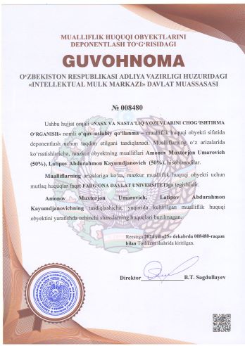 857 | №008480 | O’quv-uslubiy qo‘llanma– "NASX VA NASTA’LIQ YOZUVLARINI CHOG‘ISHTIRMA O‘RGANISH" | Amonov Muxtorjon Umarovich (50%), Latipov Abdurahmon Kayumdjanovich (50%) | FARG‘ONA DAVLAT UNIVERSITETI | 12/25/2024 | ![]() |