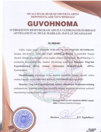 856 | №008481 | O’quv-uslubiy qo‘llanma– "KURASH TURLARI VA UNI O‘QITISH METODIKASI" | Mamatov Ulug‘bek Ergashaliyevich (50%), Azimov Adaxamjon Melikuziyevich (50%) | FARG‘ONA DAVLAT UNIVERSITETI | 12/25/2024 | ![]() |