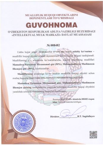 854 | №008483 | Uslubiy qo‘llanma – "SPORT TO‘GARAKLARINI TASHKIL QILISH" | Madaminov Oribdjan Nishanbayevich (50%), Ro‘ziyeva Maxliyoxon Qayumovna (50%) | FARG‘ONA DAVLAT UNIVERSITETI | 12/25/2024 | ![]() |