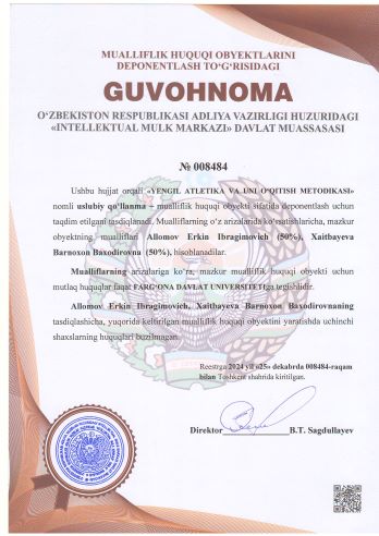853 | №008484 | Uslubiy qo‘llanma – "YENGIL ATLETIKA VA UNI O‘QITISH METODIKASI" | Allomov Erkin Ibragimovich (50%), Xaitbayeva Barnoxon Baxodirovna (50%) | FARG‘ONA DAVLAT UNIVERSITETI | 12/25/2024 | ![]() |