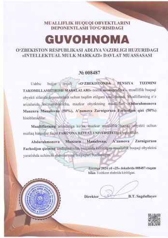 850 | №008487 | Monografiya –"O‘ZBEKISTONDA PENSIYA TIZIMINI TAKOMILLASHTIRISH MASALALARI" | Abdurahmonova Manzura Manafovna (50%), A’zamova Zarnigorxon Farhodjon qizi (50%) | FARG‘ONA DAVLAT UNIVERSITETI | 12/25/2024 | ![]() |