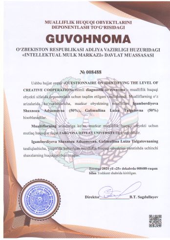 849 | №008488 | Diagnostik so‘rovnoma – "QUESTIONNAIRE ON IDENTIFYING THE LEVEL OF CREATIVE COOPERATION" | Igamberdiyeva Shaxnoza Adxamovna (50%), Galimullina Luiza Talgatovna (50%) | FARG‘ONA DAVLAT UNIVERSITETI | 12/25/2024 | ![]() |