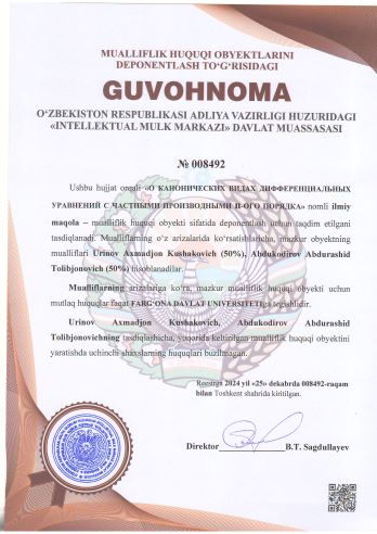 845 | №008492 | Ilmiy maqola – "О КАНОНИЧЕСКИХ ВИДАХ ДИФФЕРЕНЦИАЛЬНЫХ УРАВНЕНИЙ С ЧАСТНЫМИ ПРОИЗВОДНЫМИ n-ОГО ПОРЯДКА" | Urinov Axmadjon Kushakovich (50%), Abdukodirov Abdurashid Tolibjonovich (50%) | FARG‘ONA DAVLAT UNIVERSITETI | 12/25/2024 | ![]() |