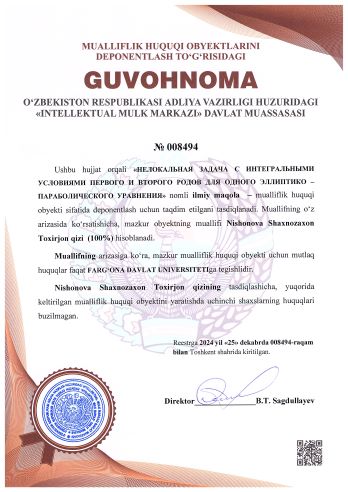 843 | №008494 | Ilmiy maqola – "НЕЛОКАЛЬНАЯ ЗАДАЧА С ИНТЕГРАЛЬНЫМИ УСЛОВИЯМИ ПЕРВОГО И ВТОРОГО РОДОВ ДЛЯ ОДНОГО ЭЛЛИПТИКО – ПАРАБОЛИЧЕСКОГО УРАВНЕНИЯ" | Nishonova Shaxnozaxon Toxirjon qizi (100%) | FARG‘ONA DAVLAT UNIVERSITETI | 12/25/2024 | ![]() |