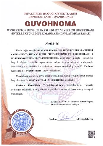 841 | №008496 | Ilmiy maqola – "ЗАДАЧА КЕЛДЫША ДЛЯ ТРЕХМЕРНОГО УРАВНЕНИЯ СМЕШАННОГО ТИПА С ТРЕМЯ СИНГУЛЯРНЫМИ КОЭФФИЦИЕНТАМИ В ПОЛУБЕСКОНЕЧНОМ ПАРАЛЛЕЛЕПИПЕДЕ" | Karimov Kamoliddin To‘ychiboyevich (100%) | FARG‘ONA DAVLAT UNIVERSITETI | 12/25/2024 | ![]() |