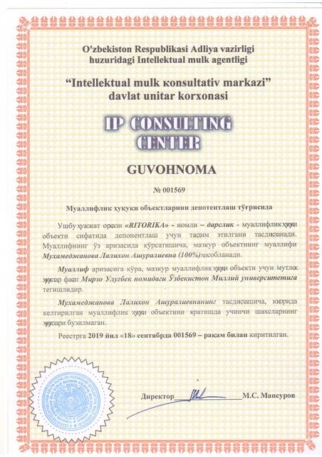 | 8619 | №001569 | Дарслик - " RITORIKA " | Мухамеджанова Лалихон Ашуралиевна (100%) | Мирзо Улуғбек номидаги Ўзбекистон Миллий университети | 09/18/2019 | ![]() |