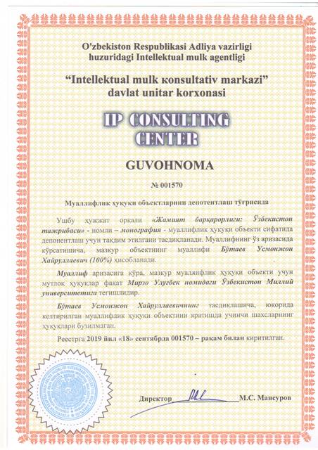 | 8618 | №001570 | Мнография - "Жамият барқарорлиги: Ўзбекистон тажрибаси" | Бўтаев Усмонжон Хайруллаевич (100%) | Мирзо Улуғбек номидаги Ўзбекистон Миллий университети | 09/18/2019 | ![]() |