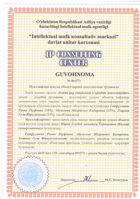 | 8617 | №001571 | Услубий қўлланма - "Sodda gap sintaksisini o’qitishda innovatsiyalar" | Сайфуллаева Раъно Рауфовна (34%), Абузалова Мехринисо Кадировна (33%), Тоирова Гули Ибрагимовна (33%) | Мирзо Улуғбек номидаги Ўзбекистон Миллий университети | 09/18/2019 | ![]() |