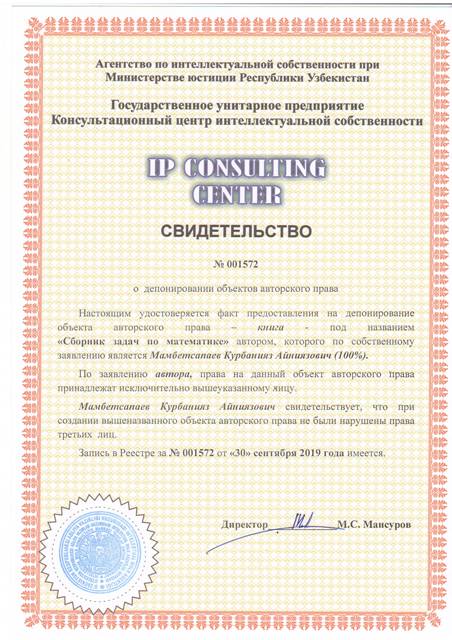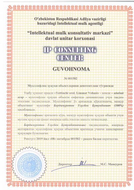 | 8606 | №001582 | Адабий асар - "Yettinchi orol. Limmat Vohasi " | Бердимуротов Улугбек Бутунбоевич (100%) | Бердимуротов Улугбек Бутунбоевич | 10/08/2019 | ![]() |