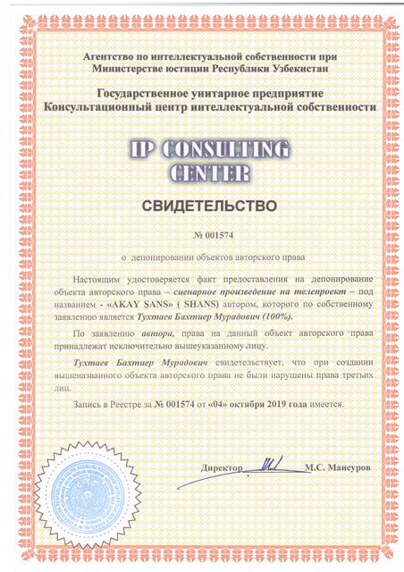 | 8614 | №001574 | Сценарное произведение на телепроект - "AKAY ŞANS" ( SHANS) | Тухтаев Бахтиер Мурадович (100%) | Тухтаев Бахтиер Мурадович | 10/04/2019 | ![]() |