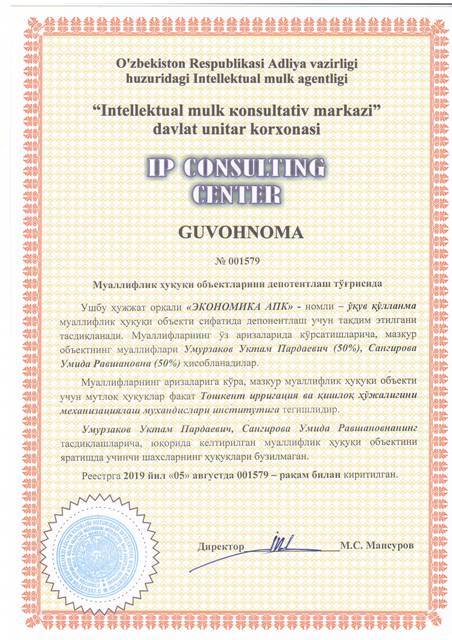 | 8609 | №001579 | Ўқув қўлланма - "ЭКОНОМИКА АПК" | Умурзаков Уктам Пардаевич (50%), Сангирова Умида Равшановна (50%) | Тошкент ирригация ва қишлоқ ҳўжалигини механизациялаш мухандислари институти | 08/05/2019 | ![]() |