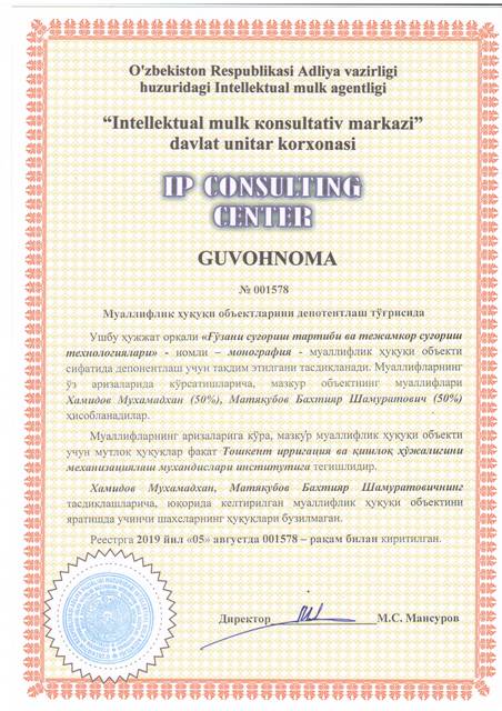 | 8610 | №001578 | Мнография - "Ғўзани суғориш тартиби ва тежамкор суғориш технологиялари" | Хамидов Мухамадхан (50%), Матякубов Бахтияр Шамуратович (50%) | Тошкент ирригация ва қишлоқ ҳўжалигини механизациялаш мухандислари институти | 08/05/2019 | ![]() |