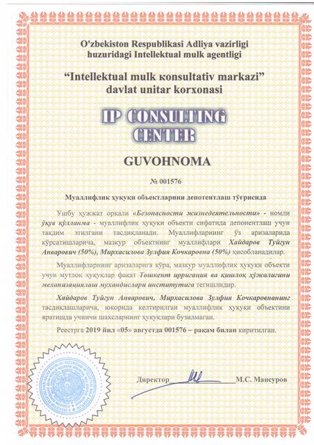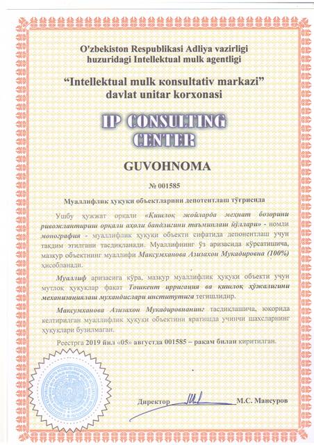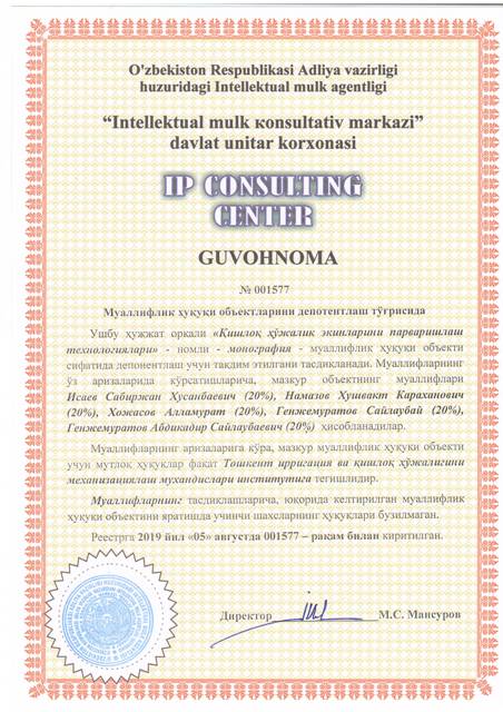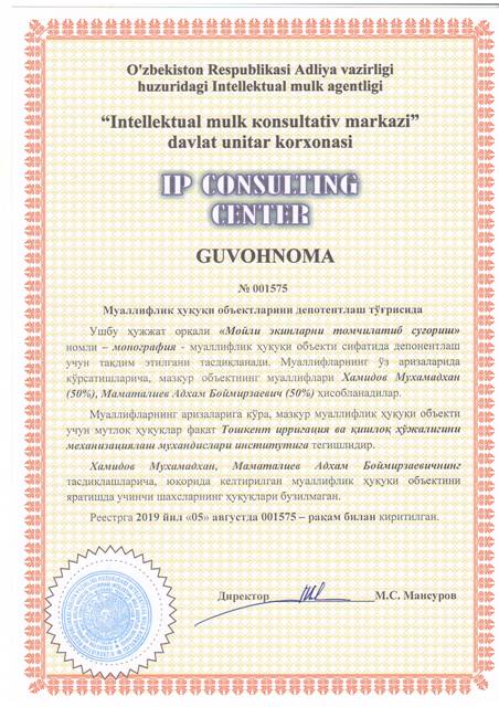 | 8613 | №001575 | Мнография - "Мойли экинларни томчилатиб суғориш" | Хамидов Мухамадхан (50%), Маматалиев Адхам Боймирзаевич (50%) | Тошкент ирригация ва қишлоқ ҳўжалигини механизациялаш мухандислари институти | 08/05/2019 | ![]() |