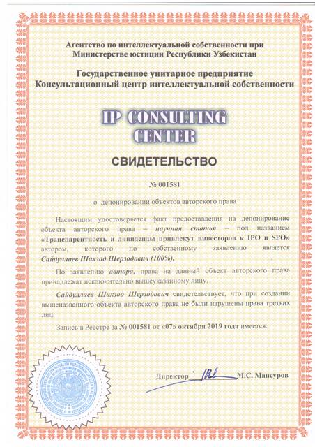 | 8607 | №001581 | Научная статья - "Транспарентность и дивиденды привлекут инвесторов к IPO и SPO" | Сайдуллаев Шахзод Шерзодович (100%) | Сайдуллаев Шахзод Шерзодович | 10/07/2019 | ![]() |