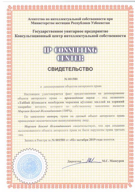 | 8608 | №001580 | Произведение науки - "Тиббий йўсиндаги мажбурлов чорасини қўллаш: миллий ва хорижий тажриба" | Мирзаев Бекзод Исамидинович (100%) | Мирзаев Бекзод Исамидинович | 10/02/2019 | ![]() |