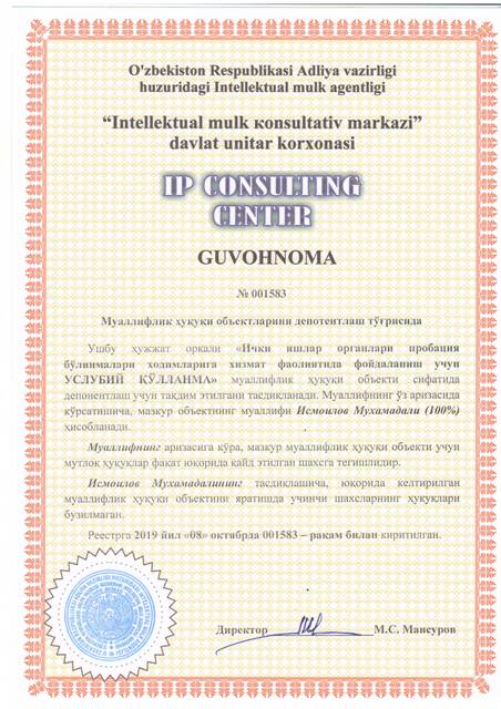 | 8605 | №001583 | Услубий қўлланма - "Ички ишлар органлари пробация бўлинмалари ходимларига хизмат фаолиятида фойдаланиш учун УСЛУБИЙ ҚЎЛЛАНМА" | Исмоилов Мухамадали (100%) | Исмоилов Мухамадали | 10/08/2019 | ![]() |