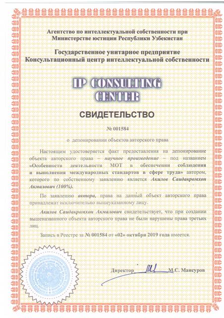 | 8604 | №001584 | Научное произведение – "Особенности деятельности МОТ в обеспечении соблюдения и выполнения международных стандартов в сфере труда" | Акилов Саидакромхон Акмалович (100%) | Акилов Саидакромхон Акмалович | 10/02/2019 | ![]() |