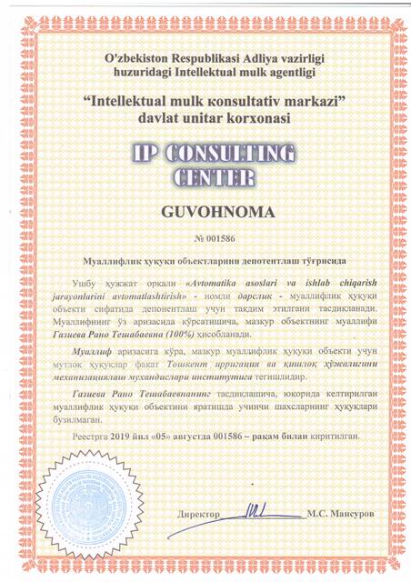 | 8602 | №001586 | Дарслик - " Avtomatika asoslari va ishlab chiqarish jarayonlarini avtomatlashtirish " | Газиева Рано Тешабаевна (100%) | Тошкент ирригация ва қишлоқ ҳўжалигини механизациялаш мухандислари институти | 08/05/2019 | ![]() |