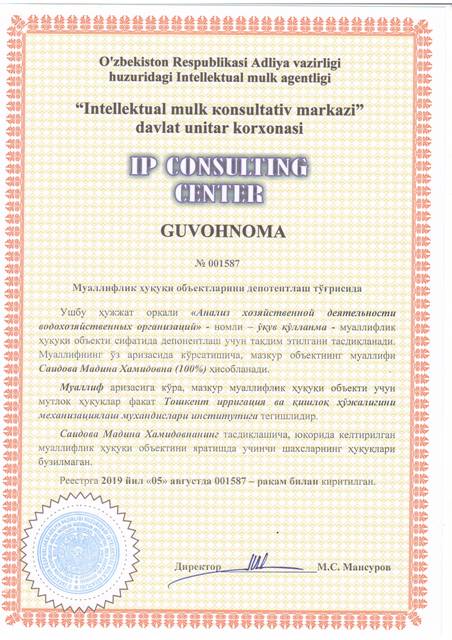 | 8601 | №001587 | Ўқув қўлланма - "Анализ хозяйственной деятельности водохозяйственных организаций" | Саидова Мадина Хамидовна (100%) | Тошкент ирригация ва қишлоқ ҳўжалигини механизациялаш мухандислари институти | 08/05/2019 | ![]() |