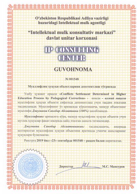 | 8640 | №001548 | Илмий мақола - "Conflicts Settlement Determined in Higher Education Process by Pedagogical Correction" | Джумаева Санобар Абсаатовна (100%) | Джумаева Санобар Абсаатовна | 09/18/2019 | ![]() |