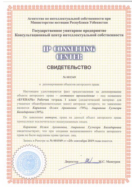 | 8639 | №001549 | Составное произведение – "БУКВАРЬ" Рабочая тетрадь 1 класс (дидактический материал для учащихся общеобразовательных школ) | Каримова Оглям Аркиновна (70%), Ашрапова Гулчехра Бахадировна (30%) | Каримова Оглям Аркиновна, Ашрапова Гулчехра Бахадировна | 09/25/2019 | ![]() |