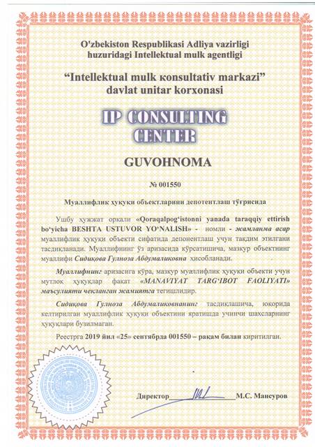 | 8638 | №001550 | Жамланма асар - "Qoraqalpog‘istonni yanada taraqqiy ettirish bo‘yicha BESHTA USTUVOR YO‘NALISH" | Сидиқова Гулноза Абдумаликовна | "MANAVIYAT TARG‘IBOT FAOLIYAT" МЧЖ | 09/25/2019 | ![]() |