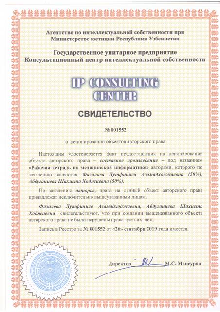 | 8636 | №001552 | Составное произведение – "Рабочая тетрадь по медицинской информатике" | Фазилова Лутфиниса Азамадходжаевна (50%), Абдуганиева Шахиста Ходжиевна (50%) | Фазилова Лутфиниса Азамадходжаевна, Абдуганиева Шахиста Ходжиевна | 09/26/2019 | ![]() |