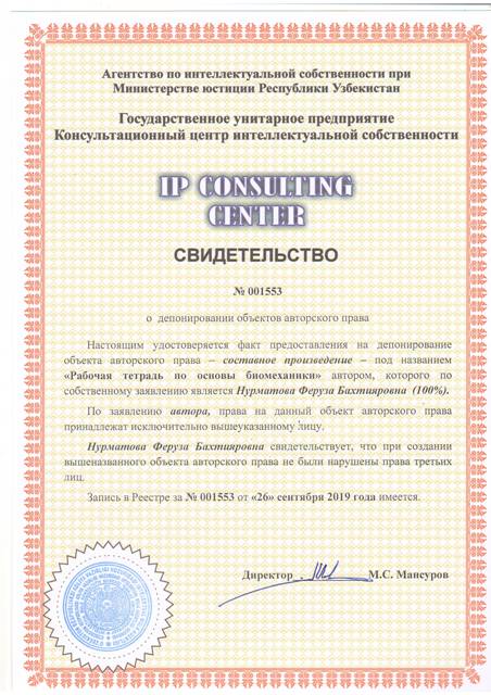 | 8635 | №001553 | Составное произведение – "Рабочая тетрадь по основы биомеханики" | Нурматова Феруза Бахтияровна (100%) | Нурматова Феруза Бахтияровна | 09/26/2019 | ![]() |