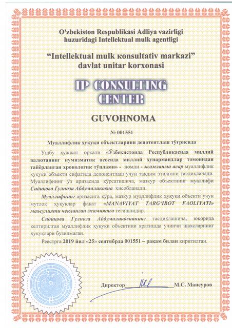 | 8637 | №001551 | Жамланма асар - "Ўзбекистон Республикасида миллий валютанинг нумизматик асосида миллий хунармандлар томонидан тайёрланган хронологик тўплами" | Сидиқова Гулноза Абдумаликовна | "MANAVIYAT TARG‘IBOT FAOLIYAT" МЧЖ | 09/25/2019 | ![]() |