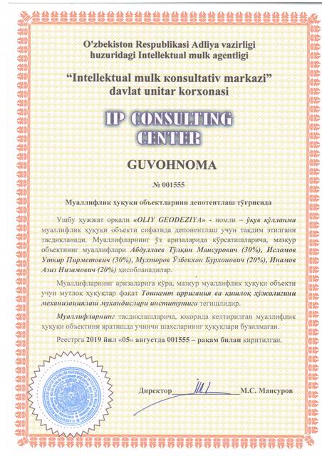 | 8633 | №001555 | Ўқув қўлланма - "OLIY GEODEZIYA" | Абдуллаев Тўлқин Мансурович (30%), Исломов Уткир Пирметович (30%), Мухторов Ўзбекхон Бурхонович (20%), Инамов Азиз Низамович (20%) | Тошкент ирригация ва қишлоқ ҳўжалигини механизациялаш мухандислари институти | 08/05/2019 | ![]() |