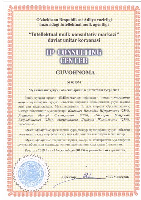 | 8634 | №001554 | Жамланма асар - "SMEcorner. uz" лойиҳаси | Юлдашев Исломбек Шухратович (25%), Рустамов Мақсуд Сувонқулович (25%), Избосаров Бобуржон Бахриддинович (25%), Маматқулова Дилфуза Жамшедовна (25%) | Юлдашев Исломбек Шухратович, Рустамов Мақсуд Сувонқулович, Избосаров Бобуржон Бахриддинович, Маматқулова Дилфуза Жамшедовна | 09/25/2019 | ![]() |