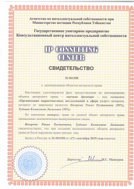 | 8630 | №001558 | Научная брошюра – "Организация маркетинговых исследований в сфере услуг" | Назарова Раъно Рустамовна (50%), Туйчиев Комилжон Лазизович (50%) | Назарова Раъно Рустамовна, Туйчиев Комилжон Лазизович | 09/27/2019 | ![]() |