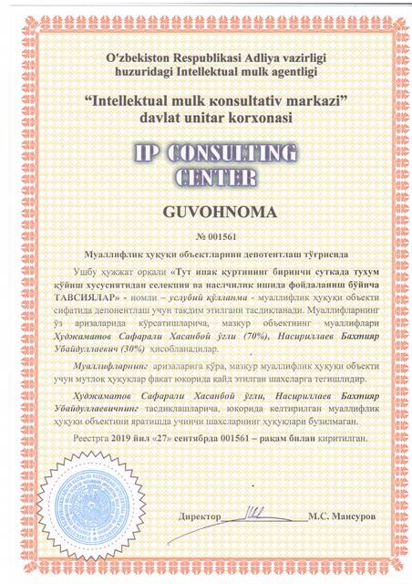 | 8627 | №001561 | Услубий қўлланма - "Тут ипак қуртининг биринчи суткада тухум қўйиш хусусиятидан селекция ва наслчилик ишида фойдаланиш бўйича ТАВСИЯЛАР" | Худжаматов Сафарали Хасанбой ўғли (70%), Насириллаев Бахтияр Убайдуллаевич (30%) | Худжаматов Сафарали Хасанбой ўғли, Насириллаев Бахтияр Убайдуллаевич | 09/27/2019 | ![]() |
