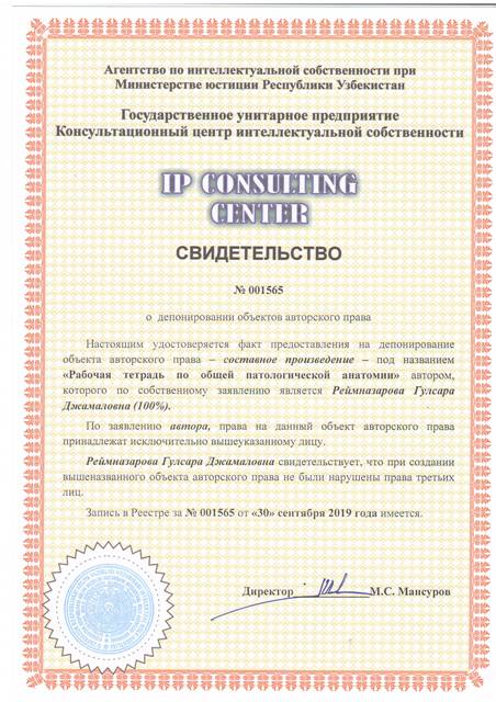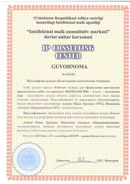 | 8629 | №001559 | Жамланма асар - "Рабочая тетрадь для оформления протоколов практических работ по предмету ФИЗИОЛОГИЯ" | Алявия Ойша Тураевна (50%), Нишонова Азизахон Абдурашидовна (50%) | Алявия Ойша Тураевна, Нишонова Азизахон Абдурашидовна | 09/27/2019 | ![]() |